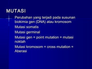 Terdapat 2 jenis mutasi. Cth penyakit.